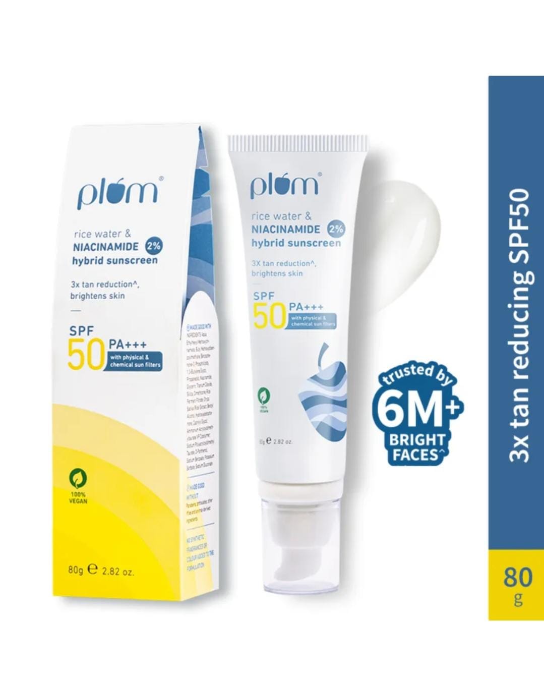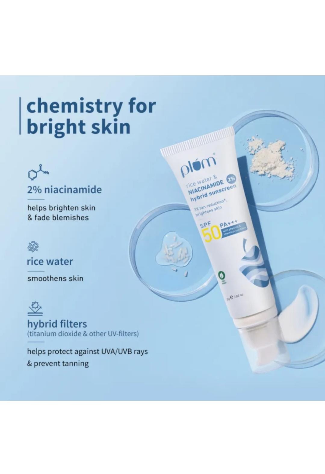Plum’s Rice Water & Niacinamide Hybrid Sunscreen offers SPF 50 PA+++ protection with a blend of physical and chemical filters. Infused with 2% niacinamide and rice water, it reduces tanning, brightens skin, and blends smoothly without white cast.
